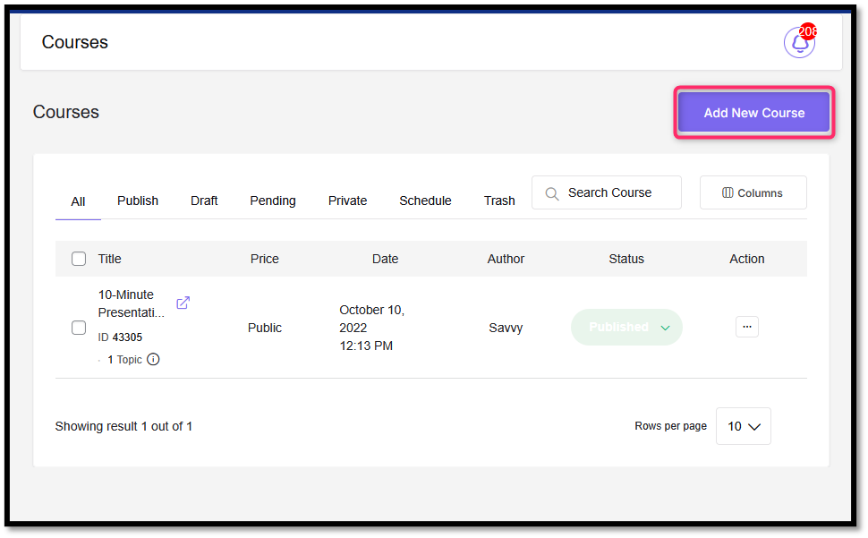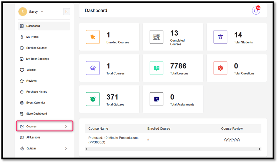 On the dashboard page, click on the “Courses” menu on the left sidebar.