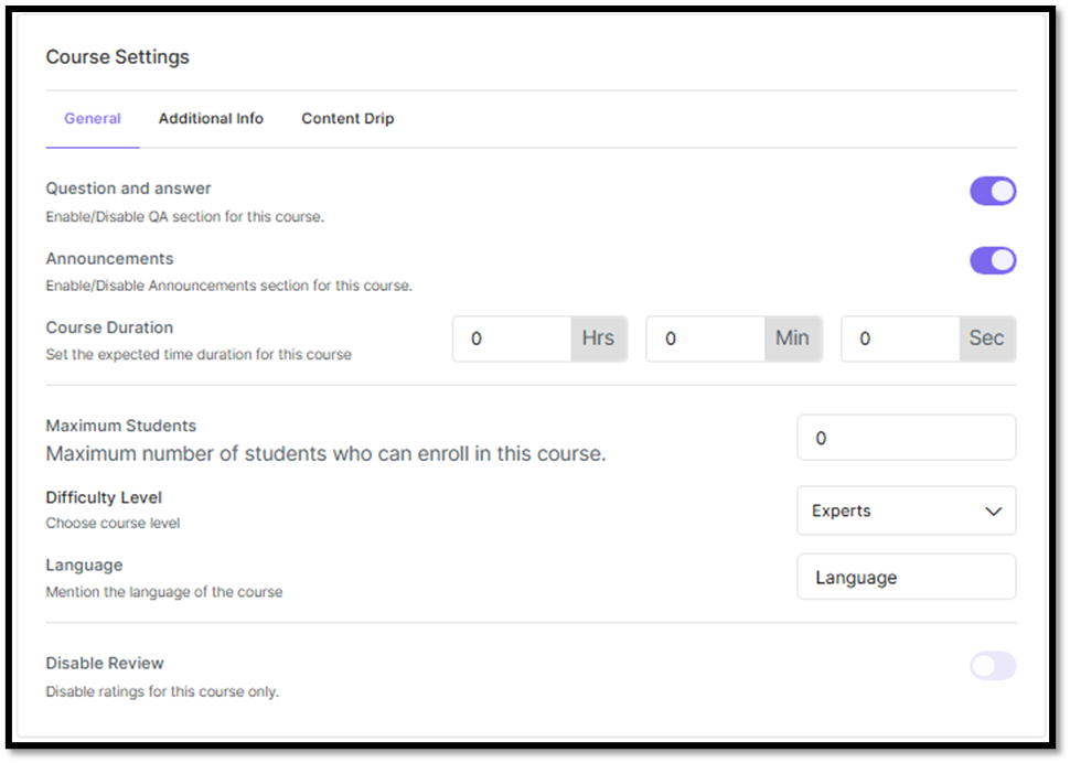 • Disable Review: Disabling reviews is useful if you want to keep feedback private or focus solely on delivering course content without public ratings.