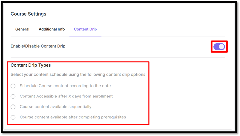 If you want to release course content gradually, enable the Content Drip option. This allows you to schedule when specific lessons or modules become available to students.