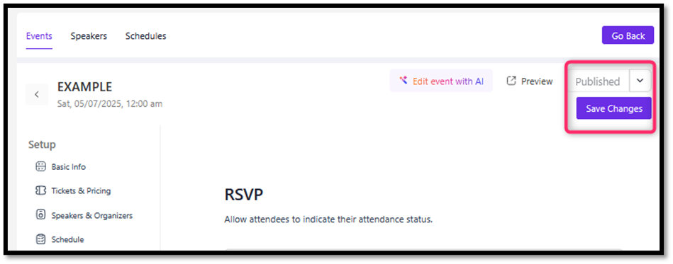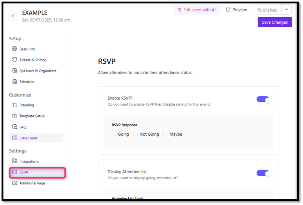 Click the Save Changes button (top right corner) to save all settings. Click the “Publish” button to publish and share your RSVP.