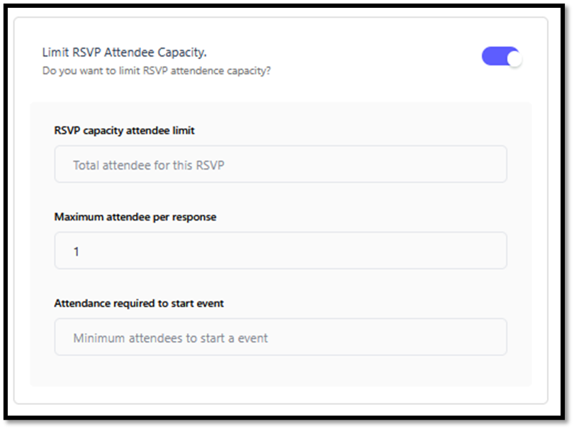 - RSVP capacity attendee limit – the maximum number of RSVP attendees.